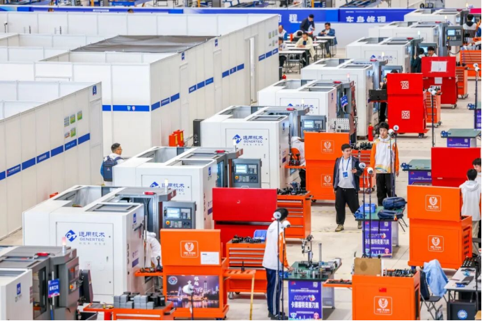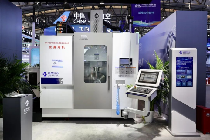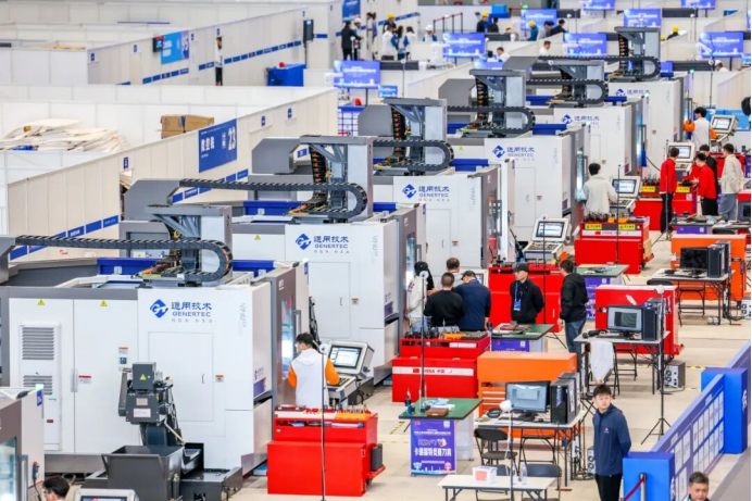 作為本屆大賽戰略合作伙伴,通用技術集團為數控銑、數控車、制造團隊挑戰賽及工業機械四項重點賽項提供了82臺自主研發的高端數控機床,涵蓋五軸加工中心、數控車床、數控銑床等核心設備。