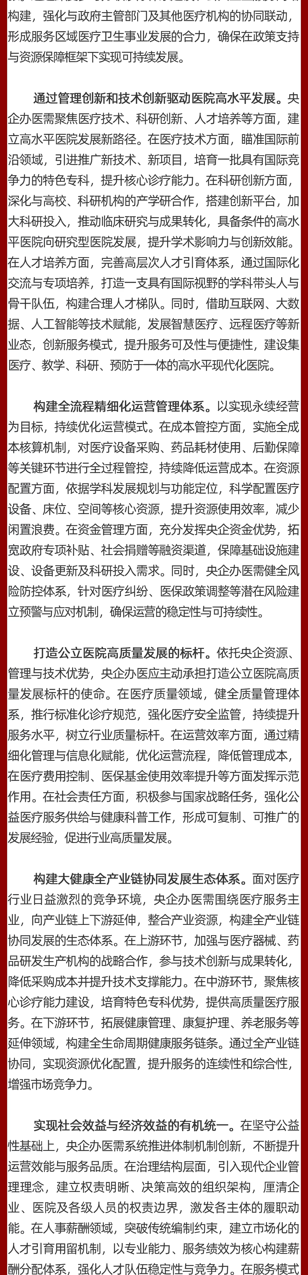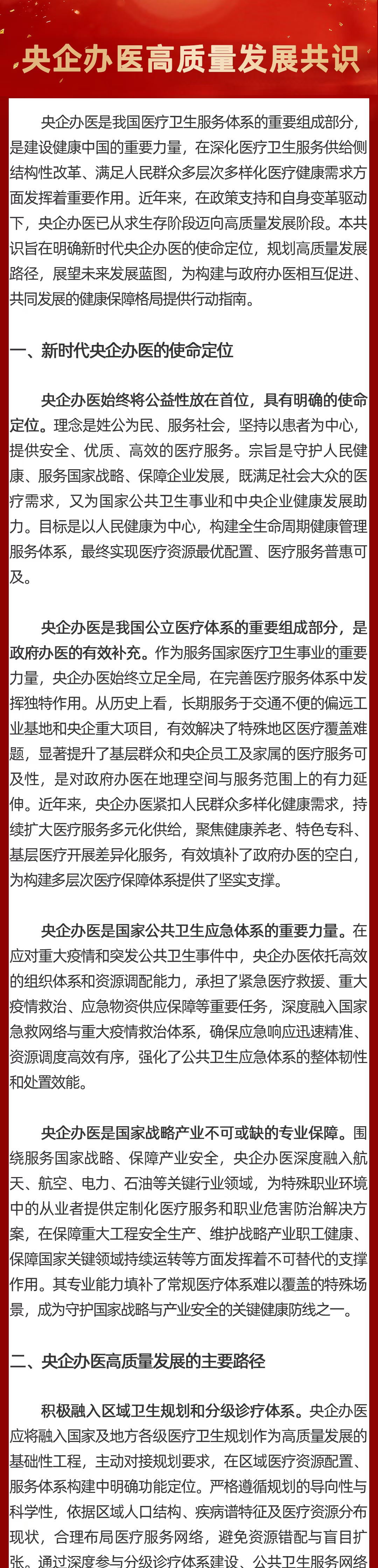 現將《共識》全文發布如下,期待與各方攜手,共同推動央企辦醫高質量發展,為增進人民健康福祉貢獻更大力量!