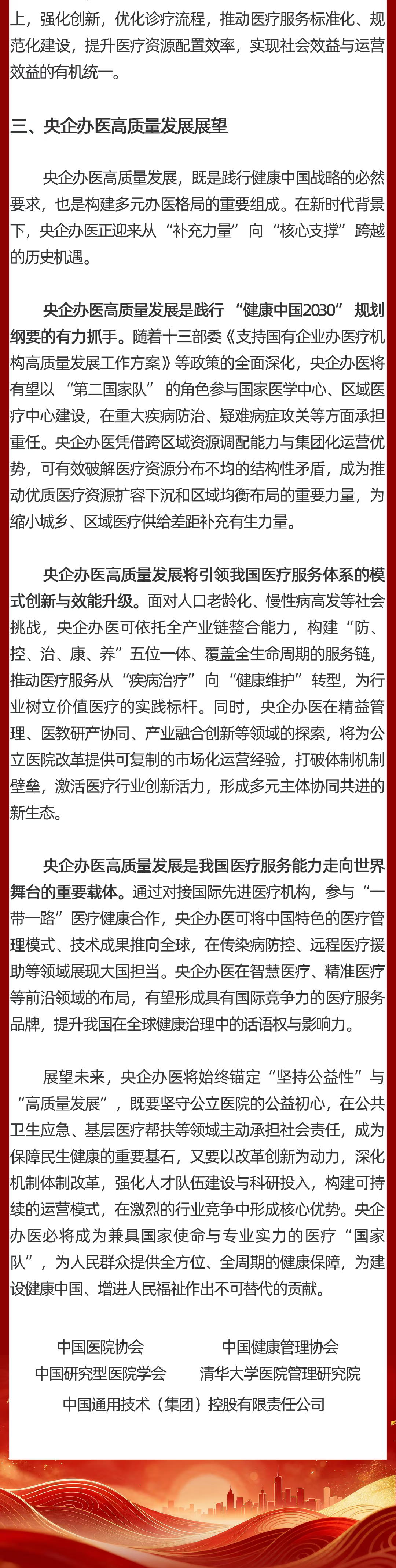 112日,由中華預防醫學會、中國醫院協會、中國健康管理協會、中國社區衛生協會、清華大學醫院管理研究院5家權威機構聯合指導,通用技術集團主辦的“2025通用健康管理大會在京成功舉辦。會上,通用技術集團與中國醫院協會、中國研究型醫院學會、中國健康管理協會、清華大學醫院管理研究院聯合發布了《央企辦醫高質量發展共識》。《共識》深刻闡釋了央企辦醫作為我國公立醫療體系重要組成部分的使命定位,始終將公益性放在首位,系統規劃了以管理創新和技術創新驅動高質量發展的主要路徑,旨在構建大健康全產業鏈協同發展生態體系。我們相信,央企辦醫將實現從補充力量核心支撐的跨越,成為踐行健康中國戰略的重要力量。